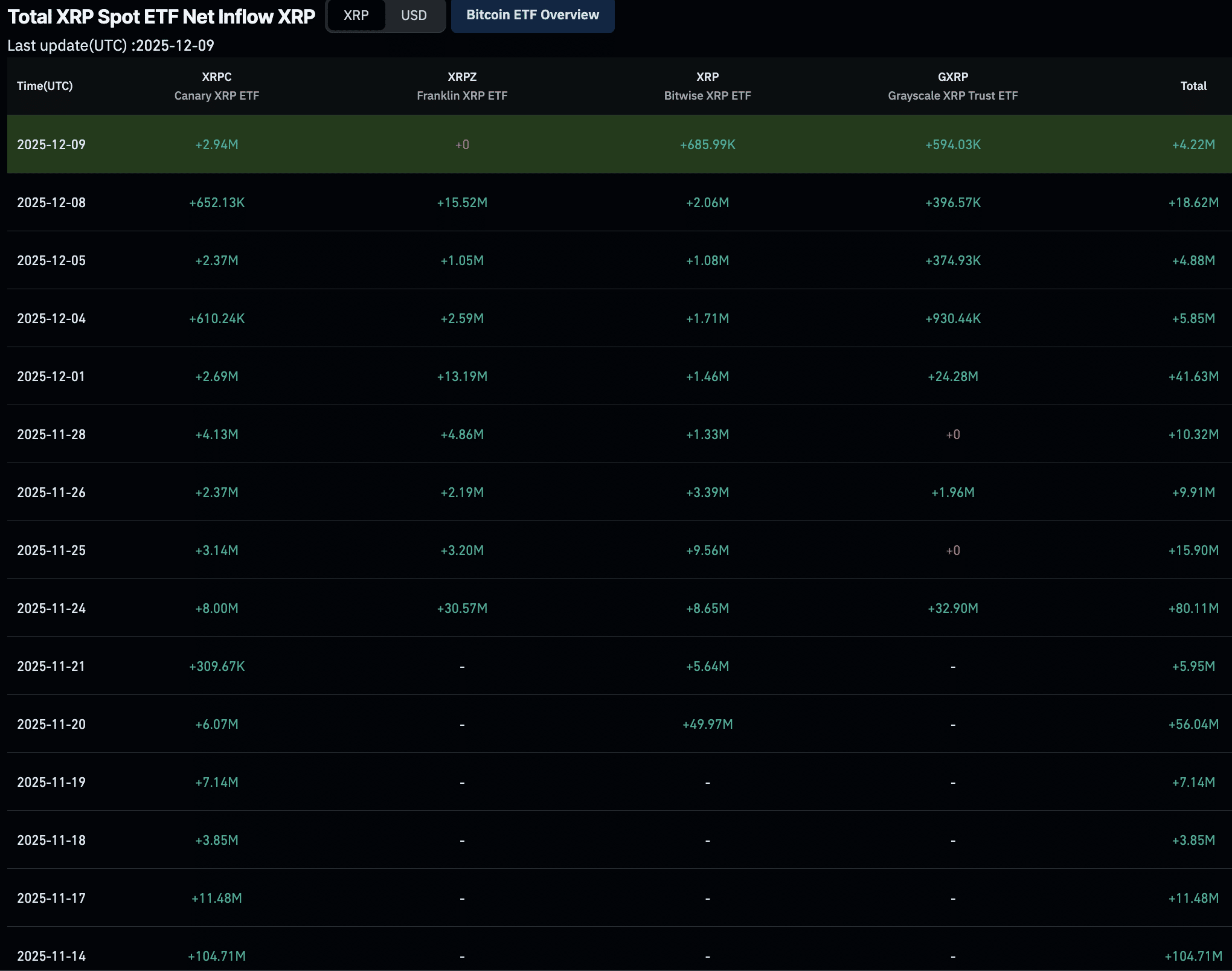 remains the strongest performer among digital assets with a spot ETF. It has now posted fifteen consecutive green days in which inflows have outweighed outflows. However, price has yet to catch up, with XRP moving just +1% overnight and currently trading at $2.06 at the time of writing.